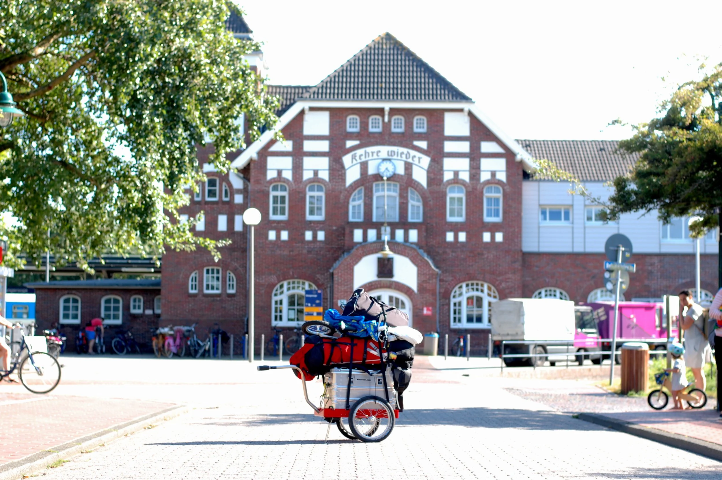 Die Nordseeinsel Wangerooge ist autofrei. Da muss man also sein Reisegepäck anders transportieren. Der Hmini im Einsatz als Handwagen für das Reisegepäck einer Familie.